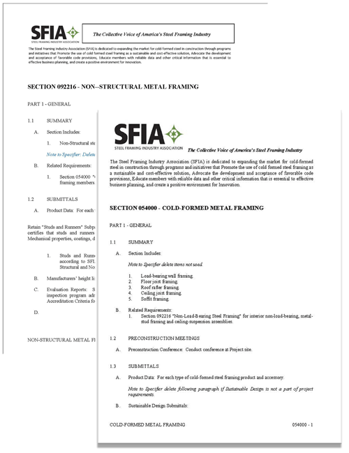 05 40 00 Cold-formed Metal Framing. For use in the preparation of a project specification section covering cold-formed steel exterior wall studs, floor joists, trusses, ceiling and roof joists, and rafters. Materials may be field installed or shop fabricated and field erected. Studs may be either axially-load bearing or non-axially load bearing.